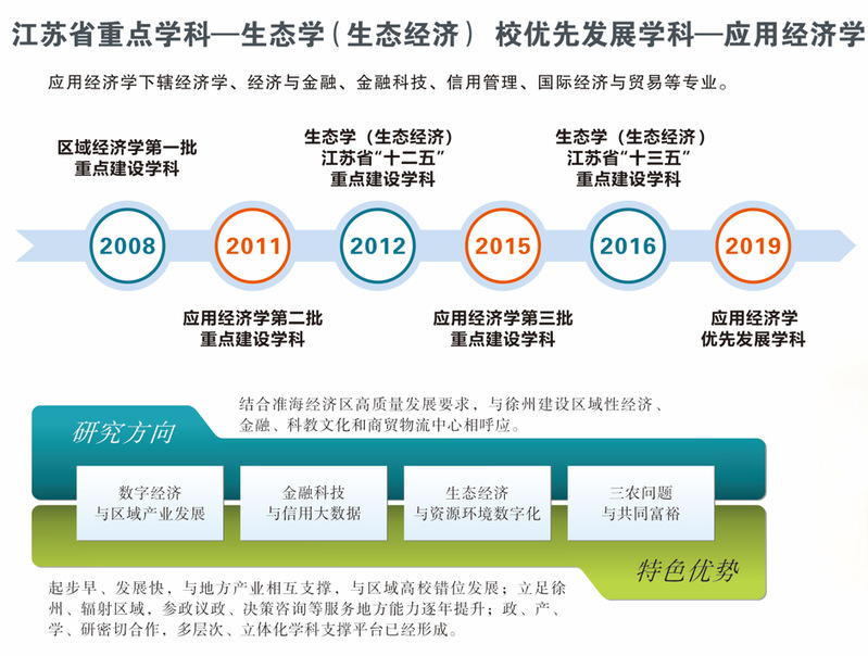 起步早、发展快,与地方产业相互支撑,与区域高校错位发展。本申请点拥有一批长期从事应用经济学(数字经济)研究与人才培养的团队队伍,自2008学校启动校级重点学科培育建设以来,应用经济学(数字经济)一直都是学校重点建设学科,并且每期考核都获得“优秀”等次。经过十多年的发展,本申请点已凝练遴选出数字经济与区域产业发展、金融科技与信用大数据、生态经济与资源环境数字化、三农问题与共同富裕四个学科研究方向,主要从事数字普惠金融、大数据金融与信用信息化、产业发展、生态经济、乡村振兴、数字产业、共同富裕等方面的研究。这些研究紧密结合淮海经济区高质量发展要求,与徐州建设区域性区域经济、金融服务、科教文化和商贸物流“四个中心”形成呼应,与在徐高校相关领域的研究互相补充,错位发展,具有一定的地域特色。